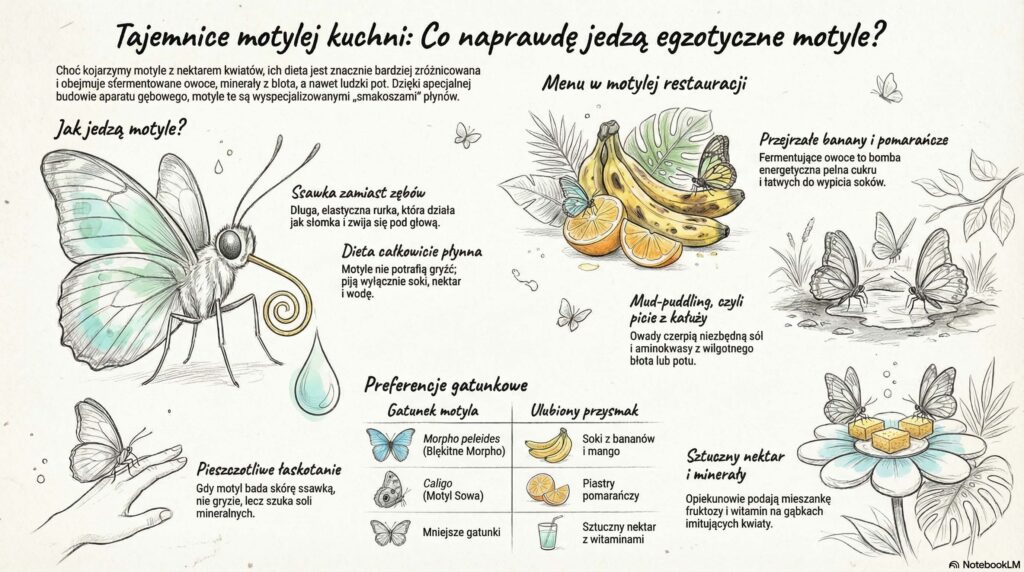 Gdybyś przejrzał menu w „motylej restauracji”, prawdopodobnie złapałbyś się za głowę. Zamiast wyłącznie świeżych kwiatów, znalazłbyś tam papkę z przejrzałych bananów, sfermentowane soki, błoto, a nawet… ludzki pot. Jak to możliwe, że jedne z najpiękniejszych stworzeń na Ziemi mają tak dziwne gusta kulinarne? Już wyjaśniamy!