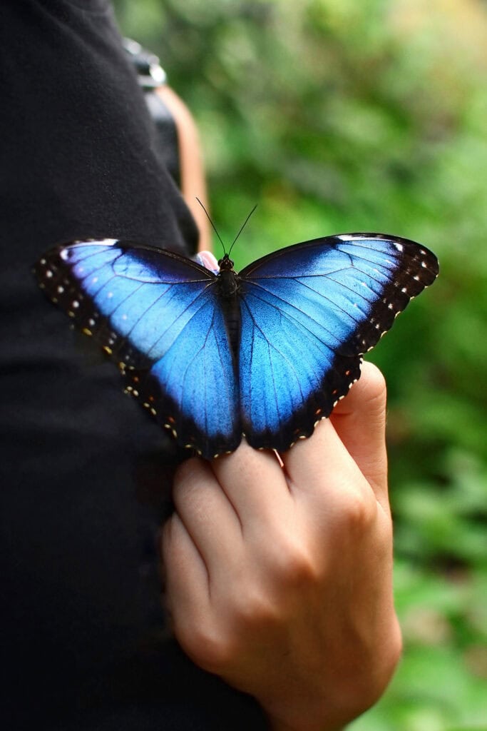 Tak, to się zdarza! Morpho są ciekawskie. Ciekawostka: najbardziej przyciągają je jaskrawe kolory ubrań (żółty, pomarańczowy) oraz… zapach perfum o nutach owocowych.