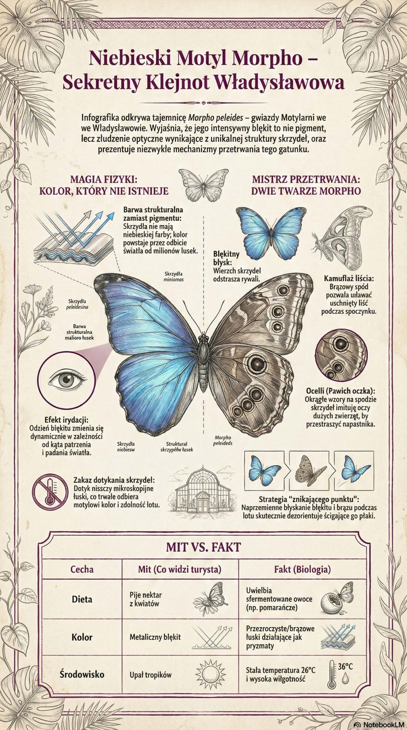 Wchodząc do Motylarni w Porcie Władysławowo, Twoją uwagę od razu przykuje intensywny, metaliczny błysk przemykający między egzotycznymi roślinami. To Morpho peleides – niekwestionowany król tropików i ulubieniec fotografów. Jednak czy uwierzysz, jeśli powiemy Ci, że ten zachwycający błękit to tylko złudzenie optyczne?